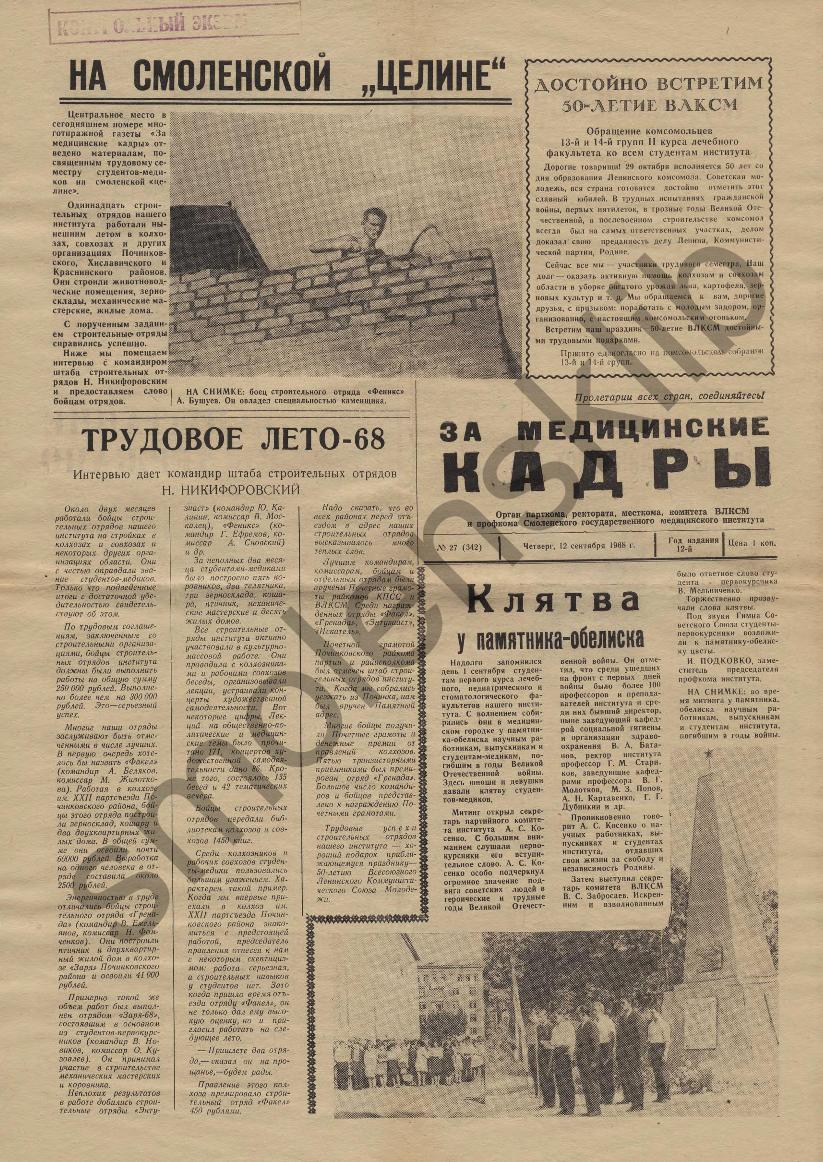 За медицинские кадры: Орган парткома, ректората, месткома, комитета ВЛКСМ и профкома Смоленского государственного медицинского института. — Смоленск: Тип. им. Смирнова, 1957-____. № 27.