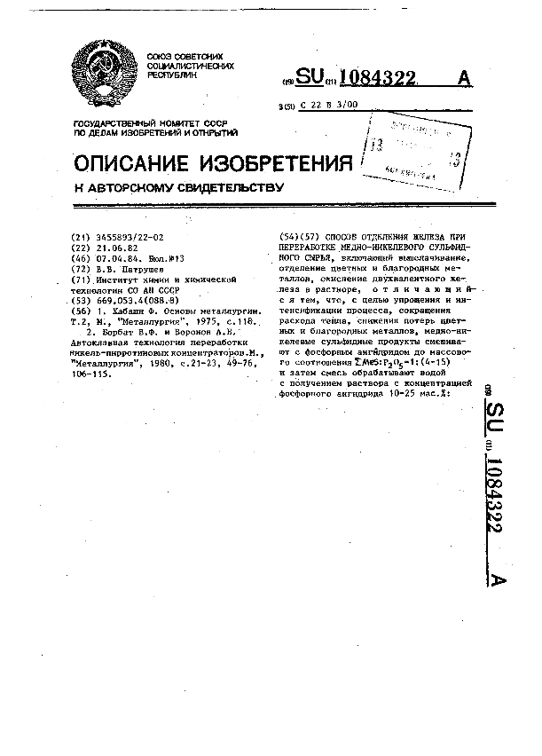 Способ отделения железа при переработке медно-никилевого сульфидного сырья / Патрушев В. В.; заявитель : Институт химии и химической технологии СО АН СССР // Описания изобретений (ретрофонд) / Комитет по патентам и товарным знакам России. – М. — (Патенты России)., 2003. – 1984, № 1. — Загл. с титул. экрана. — Систем. требования: Acrobat Reader. — Режим доступа: ftp://smolensklib.ru/bd/patent_ru/pt1084322.pdf. — <URL:ftp://smolensklib.ru/bd/patent_ru/pt1084322.pdf>.