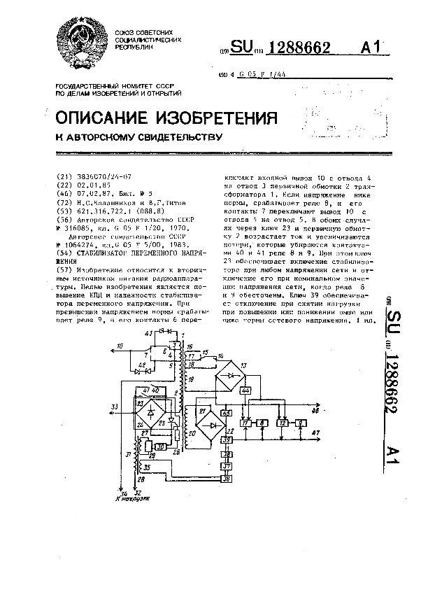 Стабилизатор переменного напряжения / Калашников Н. С., Титов В. Г. // Описания изобретений (ретрофонд) / Комитет по патентам и товарным знакам России. – М., 2003. – 1987, № 1. — (Патенты России). — Загл. с титул. экрана. — Систем. требования: Acrobat Reader. — Режим доступа: ftp://smolensklib.ru/bd/patent_ru/pt1288662.pdf. — <URL:ftp://smolensklib.ru/bd/patent_ru/pt1288662.pdf>.