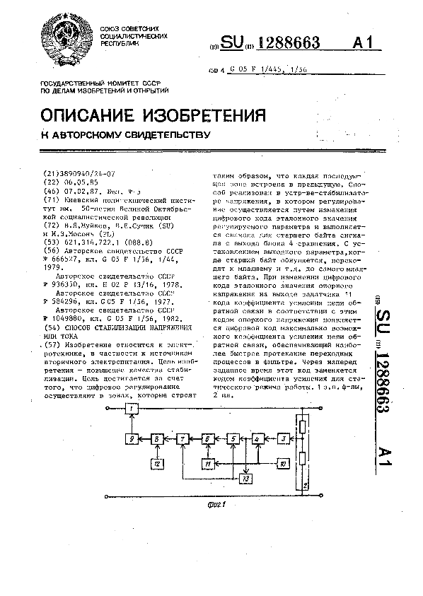 Способ стабилизации напряжения или тока / Жуйков В. Я., Сучик В. Е., Мосонь И. З.; заявитель: Киевский политехнический институт им. 50-летия Великой Октябрьской социалистической революции // Описания изобретений (ретрофонд) / Комитет по патентам и товарным знакам России. – М., 2003. – 1987, № 1. — (Патенты России). — Загл. с титул. экрана. — Систем. требования: Acrobat Reader. — Режим доступа: ftp://smolensklib.ru/bd/patent_ru/pt1288663.pdf. — <URL:ftp://smolensklib.ru/bd/patent_ru/pt1288663.pdf>.