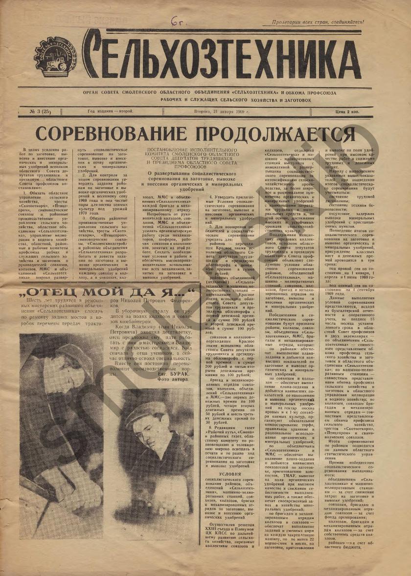Сельхозтехника: Орган совета Смоленского областного объединения "Сельхозтехника" и обкома профсоюза рабочих и служащих сельского хозяйства и заготовок. — Смоленск: Смолгортип., 1968-____. № 3.