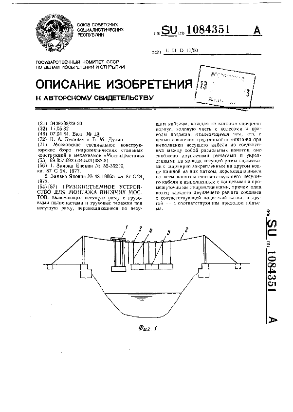 Грузоподъемное устройство для монтажа висячих мостов / Букинич В. А., Дулин Б. М.; заявитель : Московское специальное конструкторское бюро гидротехнических стальных конструкций и механизмов «Мосгидросталь» // Описания изобретений (ретрофонд) / Комитет по патентам и товарным знакам России. – М. — (Патенты России)., 2003. – 1984, № 1. — Загл. с титул. экрана. — Систем. требования: Acrobat Reader. — Режим доступа: ftp://smolensklib.ru/bd/patent_ru/pt1084351.pdf. — <URL:ftp://smolensklib.ru/bd/patent_ru/pt1084351.pdf>.