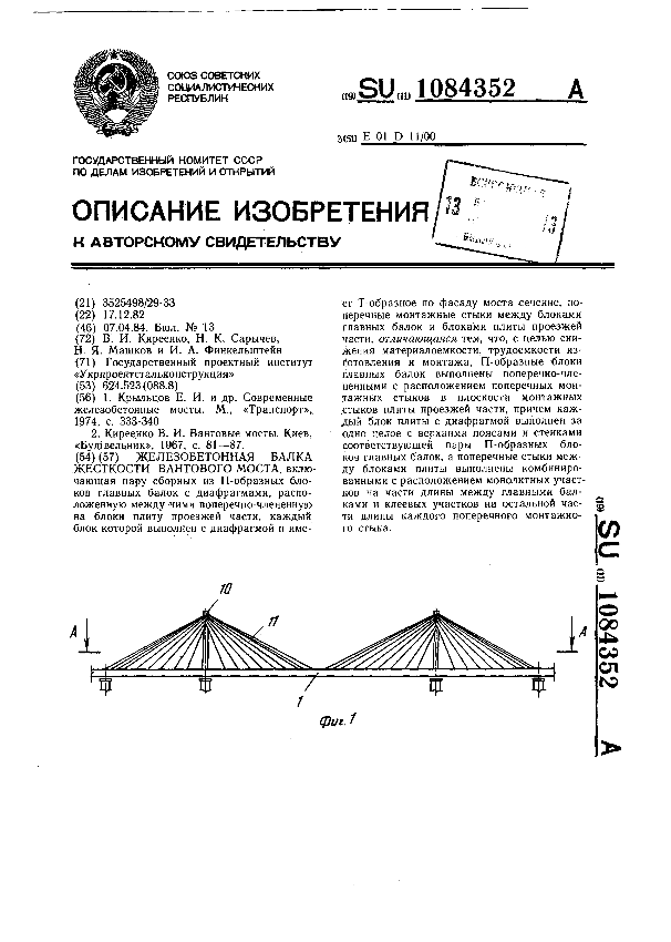Железобетонная балка жесткости вантового моста / Киреенко В. И., Сарычев Н. К., Машков Н. Я., Финкельштейн И. А.; заявитель : Государственный проектный институт «Укрпроектстальконструкция» // Описания изобретений (ретрофонд) / Комитет по патентам и товарным знакам России. – М. — (Патенты России)., 2003. – 1984, № 1. — Загл. с титул. экрана. — Систем. требования: Acrobat Reader. — Режим доступа: ftp://smolensklib.ru/bd/patent_ru/pt1084352.pdf. — <URL:ftp://smolensklib.ru/bd/patent_ru/pt1084352.pdf>.