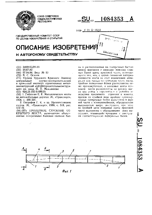 Пролетное строение открытого моста / Осипов В. С.; заявитель : Ордена Трудового Красного Знамени центральный научно-исследовательский и проектный институт строительных металлоконструкций «ЦНИИпроектстальконструкция» им. акад. Н. П. Мельникова // Описания изобретений (ретрофонд) / Комитет по патентам и товарным знакам России. – М. — (Патенты России)., 2003. – 1984, № 1. — Загл. с титул. экрана. — Систем. требования: Acrobat Reader. — Режим доступа: ftp://smolensklib.ru/bd/patent_ru/pt1084353.pdf. — <URL:ftp://smolensklib.ru/bd/patent_ru/pt1084353.pdf>.