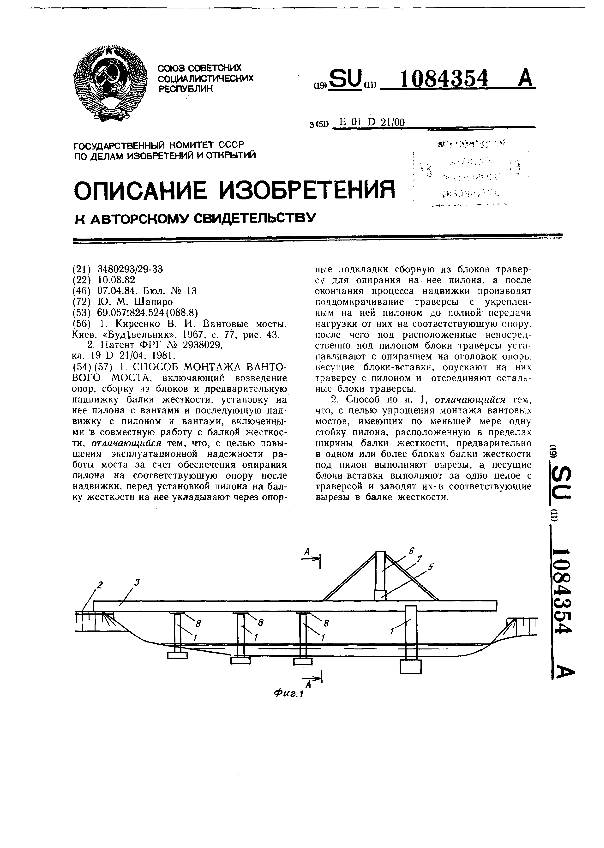 Способ монтажа вантового моста / Шапиро Ю. М. // Описания изобретений (ретрофонд) / Комитет по патентам и товарным знакам России. – М. — (Патенты России)., 2003. – 1984, № 1. — Загл. с титул. экрана. — Систем. требования: Acrobat Reader. — Режим доступа: ftp://smolensklib.ru/bd/patent_ru/pt1084354.pdf. — <URL:ftp://smolensklib.ru/bd/patent_ru/pt1084354.pdf>.