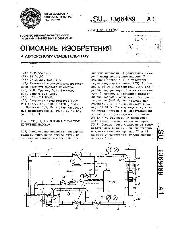 Стенд для испытания установок погружных насосов / Трусов М. М., Фисенко В. Н., Райт В. Я., Лотц Р. Э.; заявитель: Казахский научно-исследовательский институт водного хозяйства // Описания изобретений (ретрофонд) / Комитет по патентам и товарным знакам России. — М., 1994-____. — (Патенты России). – 1988, № 1. — Загл. с титул. экрана. — Систем. требования: Acrobat Reader. — Режим доступа: ftp://smolensklib.ru/bd/patent_ru/pt1368489.pdf. — <URL:ftp://smolensklib.ru/bd/patent_ru/pt1368489.pdf>.
