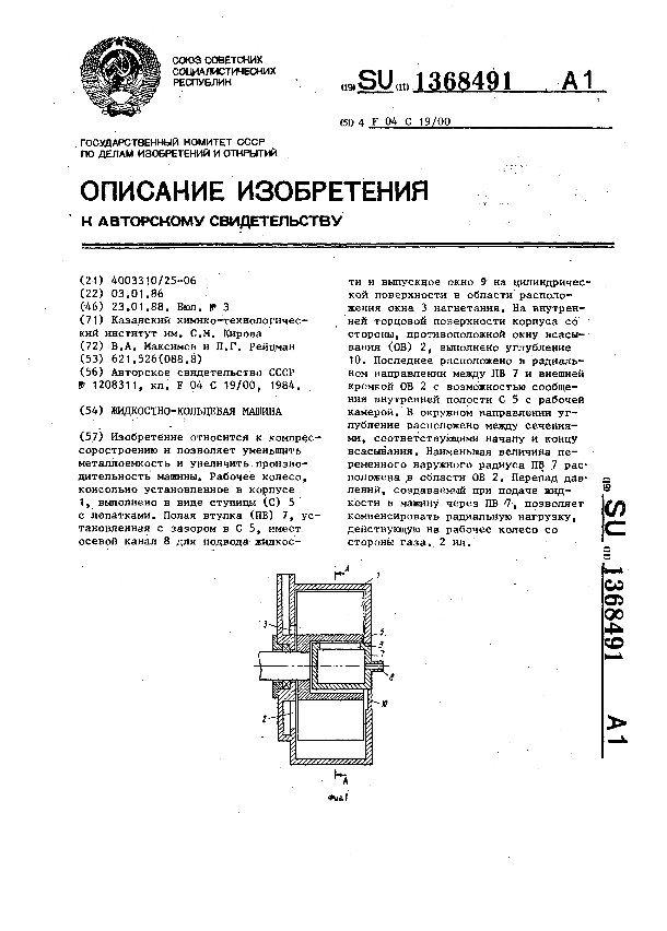 Жидкостно-кольцевая машина / Максимов В. А., Рейцман Л. Г.; заявитель: Казанский химико-технологический институт им. С. М. Кирова // Описания изобретений (ретрофонд) / Комитет по патентам и товарным знакам России. — М., 1994-____. — (Патенты России). – 1988, № 1. — Загл. с титул. экрана. — Систем. требования: Acrobat Reader. — Режим доступа: ftp://smolensklib.ru/bd/patent_ru/pt1368491.pdf. — <URL:ftp://smolensklib.ru/bd/patent_ru/pt1368491.pdf>.