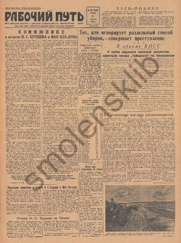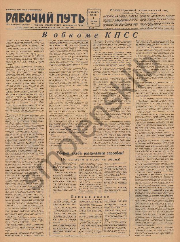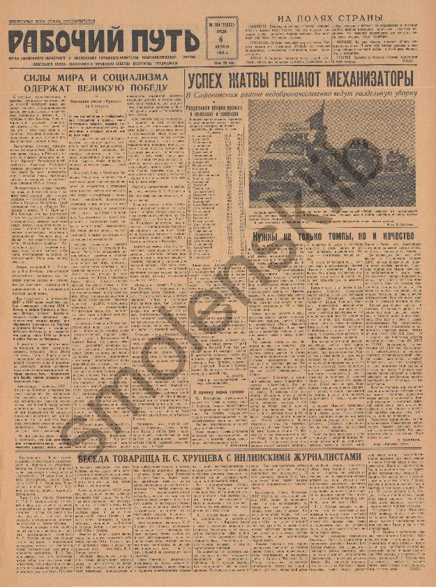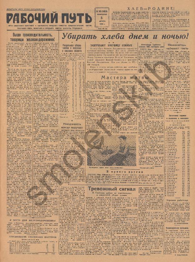 Рабочий путь / Орган Смоленского Областного и Смоленского Городского Комитетов Коммунистической партии Советского Союза, Областного и Городского Советов Депутатов Трудящихся. — Смоленск: тип. им. Смирнова, 1920-____. № 182.