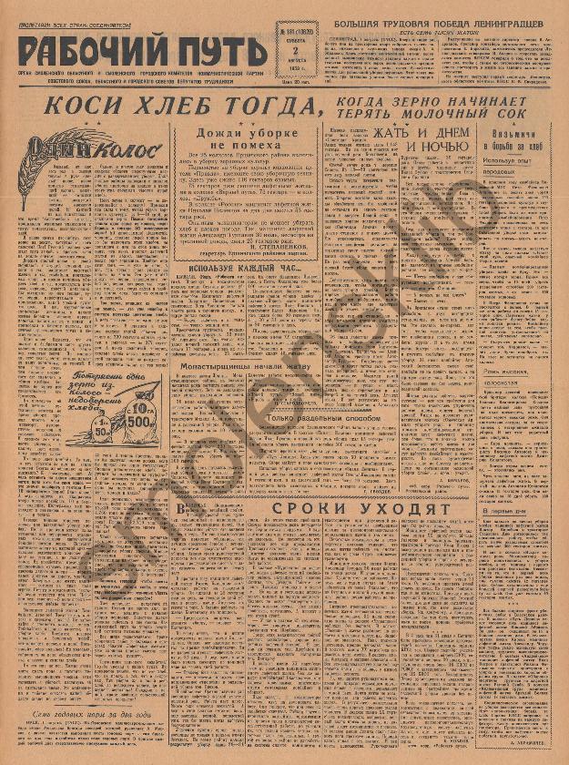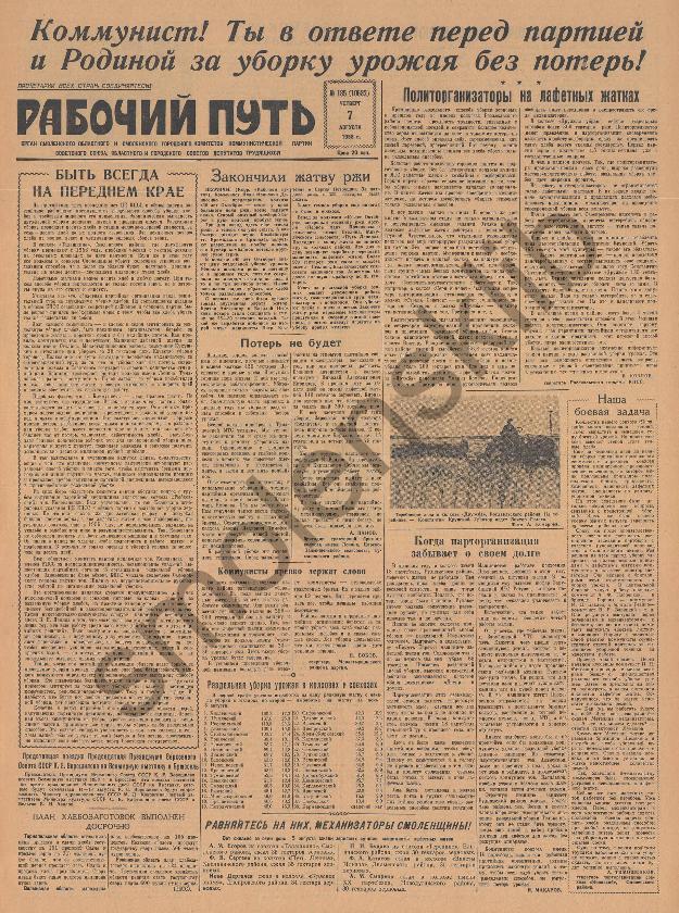 Рабочий путь / Орган Смоленского Областного и Смоленского Городского Комитетов Коммунистической партии Советского Союза, Областного и Городского Советов Депутатов Трудящихся. — Смоленск: тип. им. Смирнова, 1920-____. № 181.