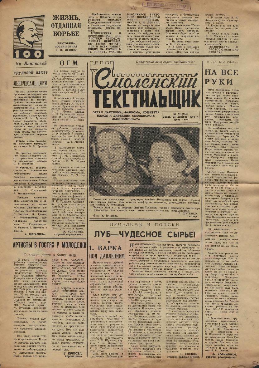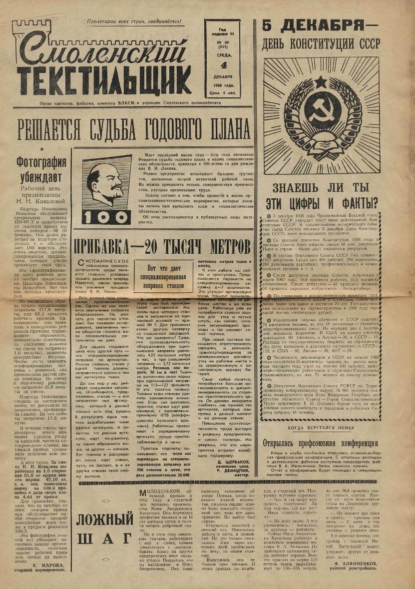 Смоленский текстильщик: Орган парткома, фабкома, комитета ВЛКСМ и дирекции Смоленского льнокомбината. — Смоленск: Тип. им. Смирнова, 1957-____. № 49.