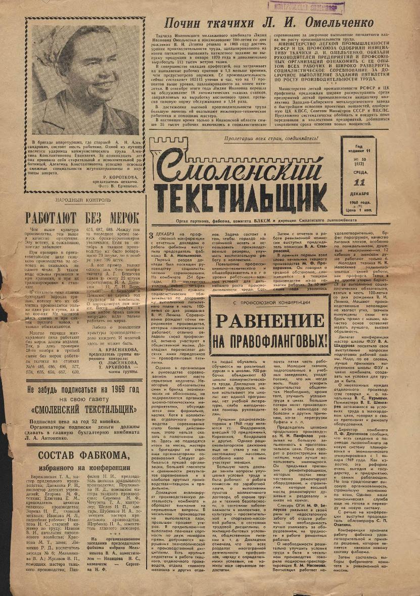 Смоленский текстильщик: Орган парткома, фабкома, комитета ВЛКСМ и дирекции Смоленского льнокомбината. — Смоленск: Тип. им. Смирнова, 1957-____. № 50.