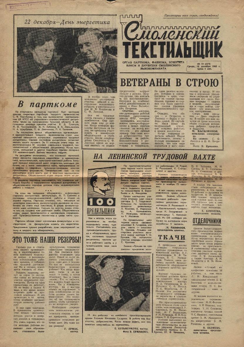Смоленский текстильщик: Орган парткома, фабкома, комитета ВЛКСМ и дирекции Смоленского льнокомбината. — Смоленск: Тип. им. Смирнова, 1957-____. № 51.