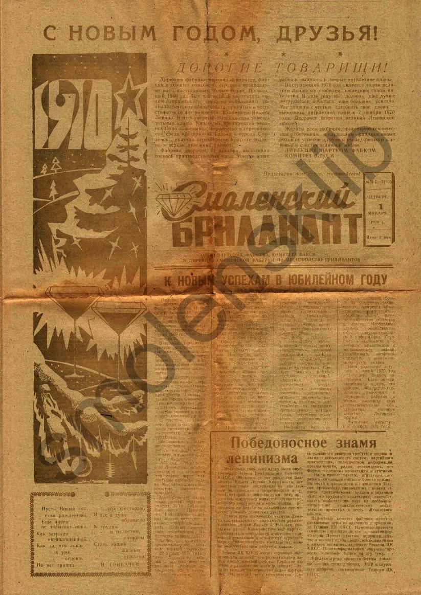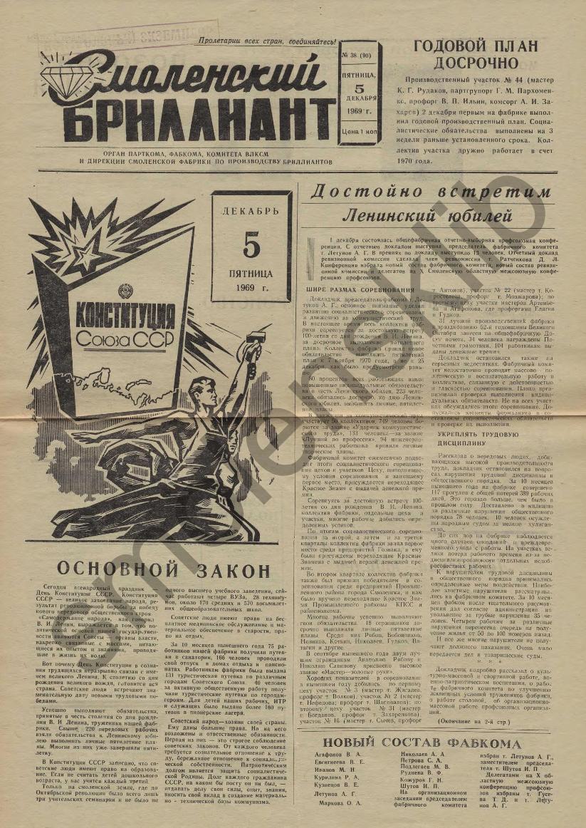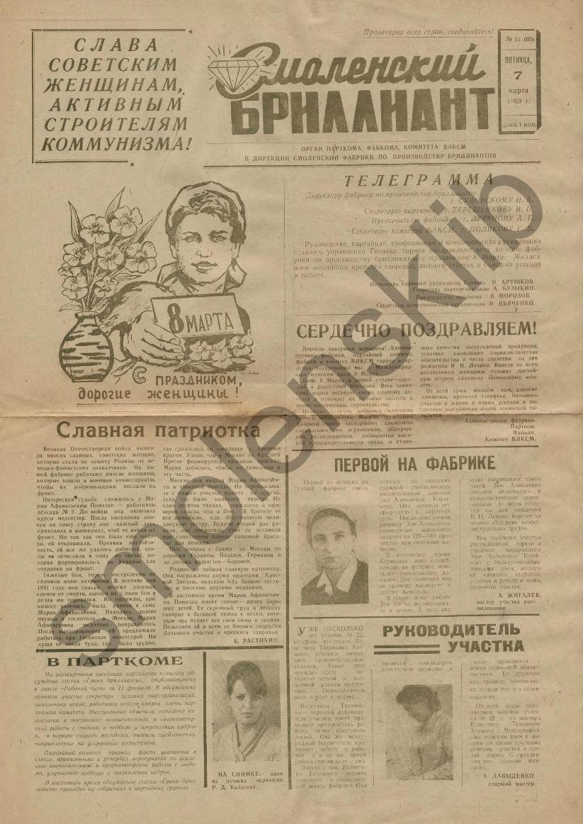 Смоленский бриллиант: Орган парткома, фабкома, комитета ВЛКСМ и дирекции Смоленской фабрики по производству бриллиантов. — Смоленск: Смолгортип., 1968-____. № 38.