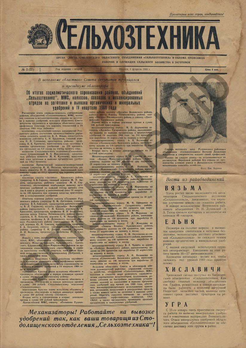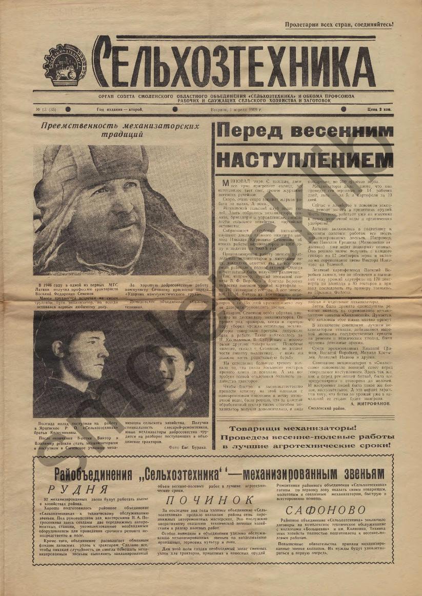 Сельхозтехника: Орган совета Смоленского областного объединения "Сельхозтехника" и обкома профсоюза рабочих и служащих сельского хозяйства и заготовок. — Смоленск: Смолгортип., 1968-____. № 13.