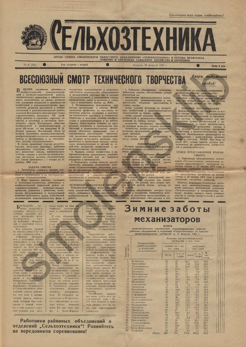 Сельхозтехника: Орган совета Смоленского областного объединения "Сельхозтехника" и обкома профсоюза рабочих и служащих сельского хозяйства и заготовок. — Смоленск: Смолгортип., 1968-____. № 8.