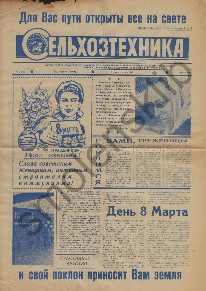 Сельхозтехника: Орган совета Смоленского областного объединения "Сельхозтехника" и обкома профсоюза рабочих и служащих сельского хозяйства и заготовок. — Смоленск: Смолгортип., 1968-____. № 9.