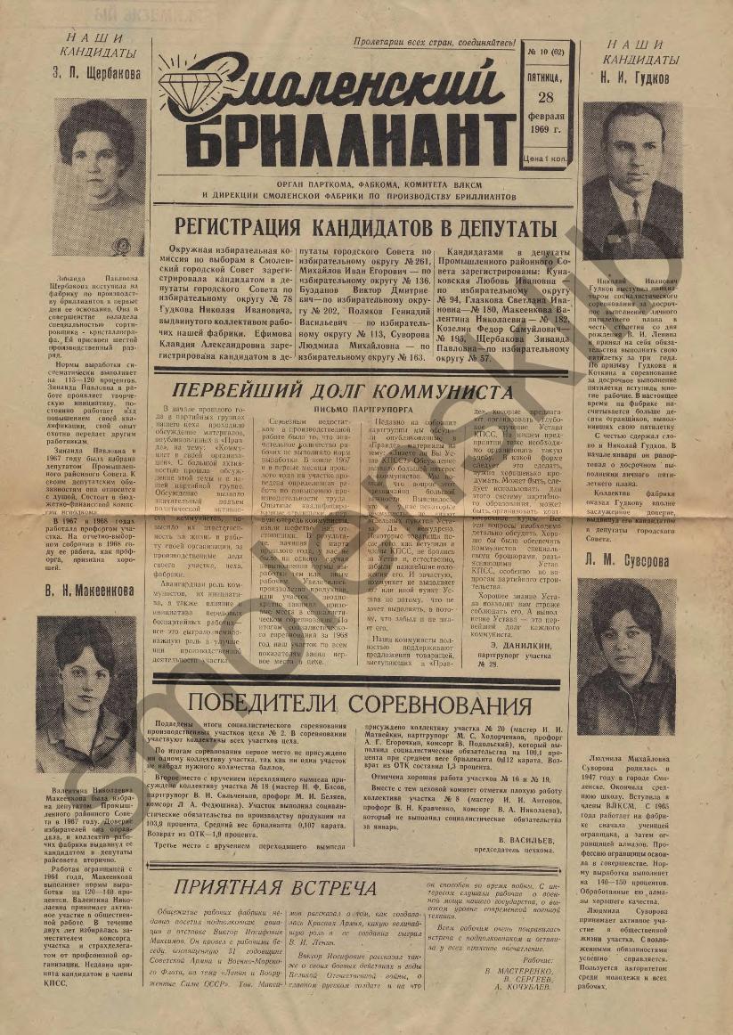 Смоленский бриллиант: Орган парткома, фабкома, комитета ВЛКСМ и дирекции Смоленской фабрики по производству бриллиантов. — Смоленск: Смолгортип., 1968-____. № 10.