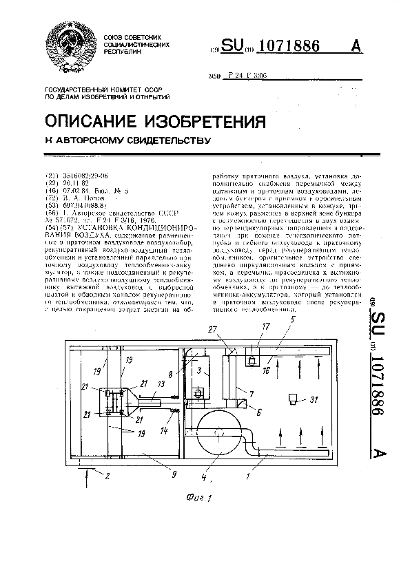 Установка кондиционирования воздуха / Попов В. А. // Описания изобретений (ретрофонд) / Комитет по патентам и товарным знакам России. – М. — (Патенты России)., 2003. – 1984, № 1. — Загл. с титул. экрана. — Поисковая система: ИПС MIMOSA GTI. — Систем. требования: Acrobat Reader. — Режим доступа: ftp://smolensklib.ru/bd/patent_ru/pt1071886.pdf. — <URL:ftp://smolensklib.ru/bd/patent_ru/pt1071886.pdf>.