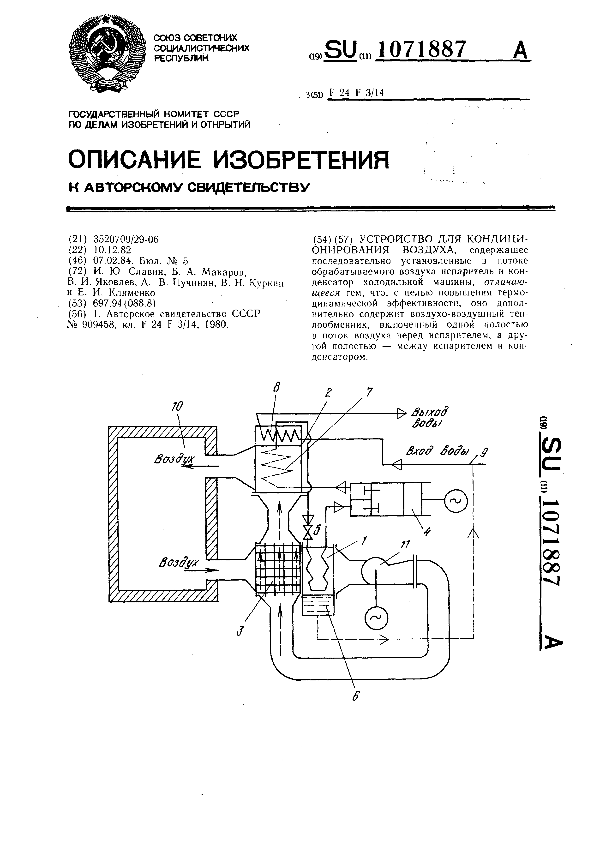 Устройство для кондиционирования воздуха / Славин И. Ю., Макаров Б. А., Яковлев В. И. [и др.] // Описания изобретений (ретрофонд) / Комитет по патентам и товарным знакам России. – М. — (Патенты России)., 2003. – 1984, № 1. — Загл. с титул. экрана. — Поисковая система: ИПС MIMOSA GTI. — Систем. требования: Acrobat Reader. — Режим доступа: ftp://smolensklib.ru/bd/patent_ru/pt1071887.pdf. — <URL:ftp://smolensklib.ru/bd/patent_ru/pt1071887.pdf>.