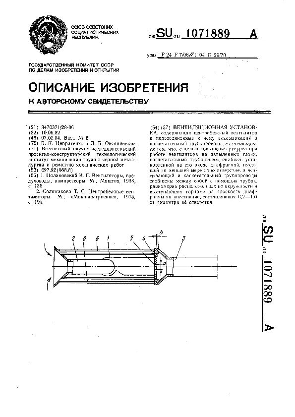 Вентиляционная установка / Цебратенко В. К., Овсянникова Л. Б.; заявитель: Всесоюзный научно-исследовательский проектно-конструкторский технологический институт механизации труда в черной металлургии и ремонтно-механических работ // Описания изобретений (ретрофонд) / Комитет по патентам и товарным знакам России. – М. — (Патенты России)., 2003. – 1984, № 1. — Загл. с титул. экрана. — Поисковая система: ИПС MIMOSA GTI. — Систем. требования: Acrobat Reader. — Режим доступа: ftp://smolensklib.ru/bd/patent_ru/pt1071889.pdf. — <URL:ftp://smolensklib.ru/bd/patent_ru/pt1071889.pdf>.