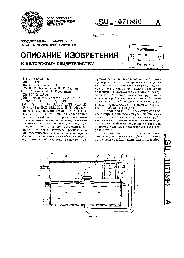 Устройство для удаления вредных выделений / Бондаренко В. М., Тройнин В. Е., Авдеев Н. А., Поздняков М. В. // Описания изобретений (ретрофонд) / Комитет по патентам и товарным знакам России. – М. — (Патенты России)., 2003. – 1984, № 1. — Загл. с титул. экрана. — Поисковая система: ИПС MIMOSA GTI. — Систем. требования: Acrobat Reader. — Режим доступа: ftp://smolensklib.ru/bd/patent_ru/pt1071890.pdf. — <URL:ftp://smolensklib.ru/bd/patent_ru/pt1071890.pdf>.