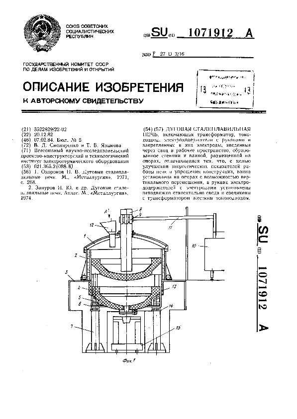Дуговая сталеплавильная печь / Смоляренко В. Д., Языкова Т. Б.; заявитель: Всесоюзный научно-исследовательский проектно-конструкторский и технологический институт электротермического оборудования // Описания изобретений (ретрофонд) / Комитет по патентам и товарным знакам России. – М. — (Патенты России)., 2003. – 1984, № 1. — Загл. с титул. экрана. — Поисковая система: ИПС MIMOSA GTI. — Систем. требования: Acrobat Reader. — Режим доступа: ftp://smolensklib.ru/bd/patent_ru/pt1071912.pdf. — <URL:ftp://smolensklib.ru/bd/patent_ru/pt1071912.pdf>.