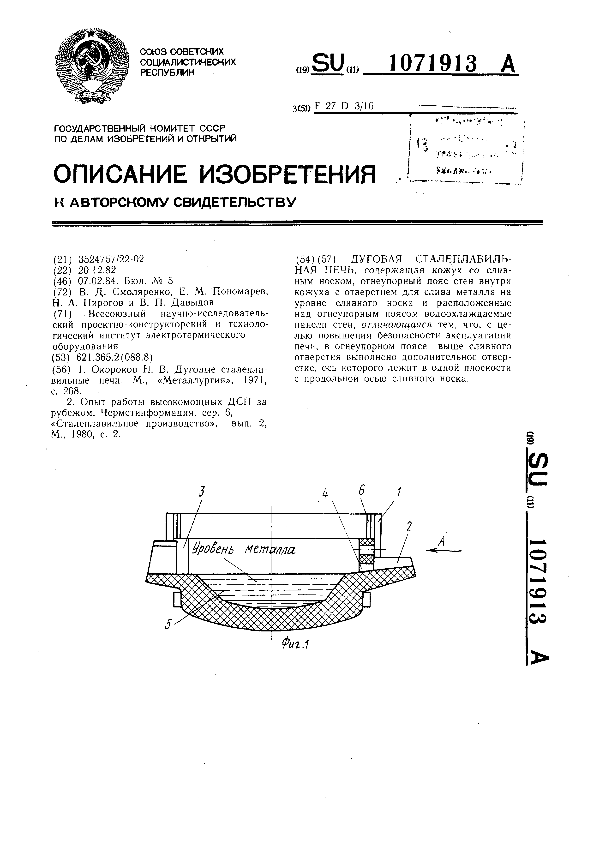 Дуговая сталеплавильная печь / Смоляренко В. Д., Пономарев Е. М., Пирогов Н. А., Давыдов В. П.; заявитель: Всесоюзный научно-исследовательский проектно-конструкторский и технологический институт электротермического оборудования // Описания изобретений (ретрофонд) / Комитет по патентам и товарным знакам России. – М. — (Патенты России)., 2003. – 1984, № 1. — Загл. с титул. экрана. — Поисковая система: ИПС MIMOSA GTI. — Систем. требования: Acrobat Reader. — Режим доступа: ftp://smolensklib.ru/bd/patent_ru/pt1071913.pdf. — <URL:ftp://smolensklib.ru/bd/patent_ru/pt1071913.pdf>.