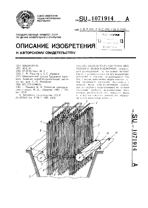 Охладитель системы оборотного водоснабжения / Рыжков С. В., Рыжков С. С.; заявитель: Николаевский ордена Трудового Красного Знамени кораблестроительный институт им. адм. С. О. Макарова // Описания изобретений (ретрофонд) / Комитет по патентам и товарным знакам России. – М. — (Патенты России)., 2003. – 1984, № 1. — Загл. с титул. экрана. — Поисковая система: ИПС MIMOSA GTI. — Систем. требования: Acrobat Reader. — Режим доступа: ftp://smolensklib.ru/bd/patent_ru/pt1071914.pdf. — <URL:ftp://smolensklib.ru/bd/patent_ru/pt1071914.pdf>.