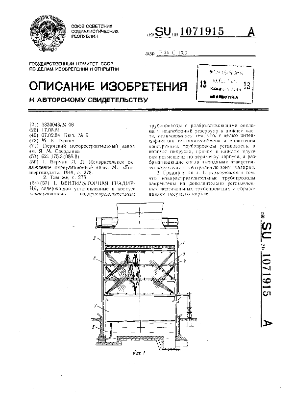 Вентиляторная градирня / Турков М. Е.; заявитель: Пермский моторостроительный завод им. Я. М. Свердлова // Описания изобретений (ретрофонд) / Комитет по патентам и товарным знакам России. – М. — (Патенты России)., 2003. – 1984, № 1. — Загл. с титул. экрана. — Поисковая система: ИПС MIMOSA GTI. — Систем. требования: Acrobat Reader. — Режим доступа: ftp://smolensklib.ru/bd/patent_ru/pt1071915.pdf. — <URL:ftp://smolensklib.ru/bd/patent_ru/pt1071915.pdf>.