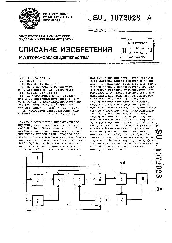 Устройство дистанционного питания / Бушуев В. М., Коротич А. Г.,Ножников В. М., Сергейчева Н. М. // Описания изобретений (ретрофонд) / Комитет по патентам и товарным знакам России. – М. — (Патенты России)., 2003. – 1984, № 1. — Загл. с титул. экрана. — Систем. требования: Acrobat Reader. — Режим доступа: ftp://smolensklib.ru/bd/patent_ru/pt1072028.pdf. — <URL:ftp://smolensklib.ru/bd/patent_ru/pt1072028.pdf>.