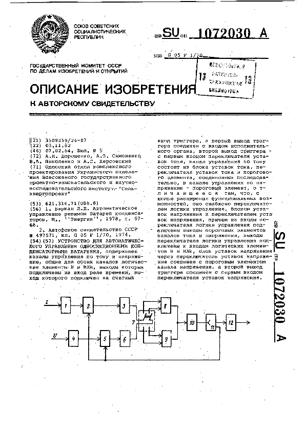 Устройство для автоматического управления односекционными конденсаторными батареями / Дорошенко А. И., Симоненко А. З., Николенко В. А., Херсонский А. С.; заявитель: Одесский отдел комплексного проектирования Украинского отделения Всесоюзного государственного проектно-изыскательского и научно-исследовательского института "Сельэнергопроект" // Описания изобретений (ретрофонд) / Комитет по патентам и товарным знакам России. – М. — (Патенты России)., 2003. – 1984, № 1. — Загл. с титул. экрана. — Систем. требования: Acrobat Reader. — Режим доступа: ftp://smolensklib.ru/bd/patent_ru/pt1072030.pdf. — <URL:ftp://smolensklib.ru/bd/patent_ru/pt1072030.pdf>.