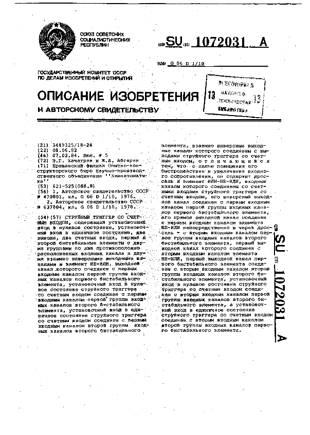 Струйный триггер со счетным входом / Хачатрян Э. Г., Абгарян Ж. А.; заявитель: Ереванский филиал Опытно-конструкторского бюро Научно-производственного объединения "Химавтоматика" // Описания изобретений (ретрофонд) / Комитет по патентам и товарным знакам России. – М. — (Патенты России)., 2003. – 1984, № 1. — Загл. с титул. экрана. — Систем. требования: Acrobat Reader. — Режим доступа: ftp://smolensklib.ru/bd/patent_ru/pt1072031.pdf. — <URL:ftp://smolensklib.ru/bd/patent_ru/pt1072031.pdf>.