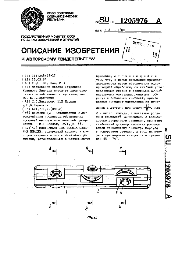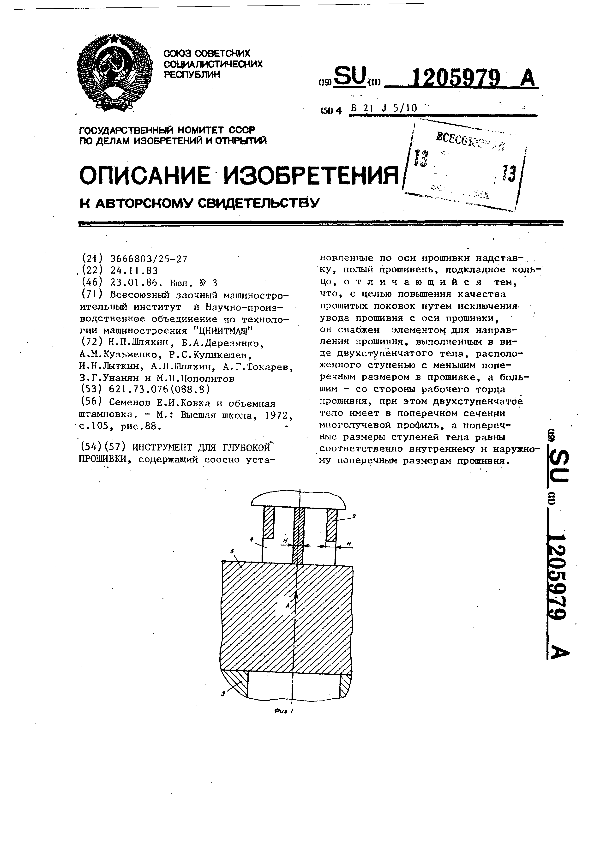 Инструмент для глубокой прошивки / Шляхин Н. П., Деревянко Б. А., Кузьменко А. М. [и др.]; заявитель: Всесоюзный заочный машиностроительный институт, Научно-производственное объединение по технологии машиностроения "ЦНИИТМАШ" // Описания изобретений (ретрофонд) / Комитет по патентам и товарным знакам России. – М., 2003. – 1986, № 1. — (Патенты России). — Загл. с титул. экрана. — Поисковая система: ИПС MIMOSA GTI. — Систем. требования: Acrobat Reader. — Режим доступа: ftp://smolensklib.ru/bd/patent_ru/pt1205979.pdf. — <URL:ftp://smolensklib.ru/bd/patent_ru/pt1205979.pdf>.