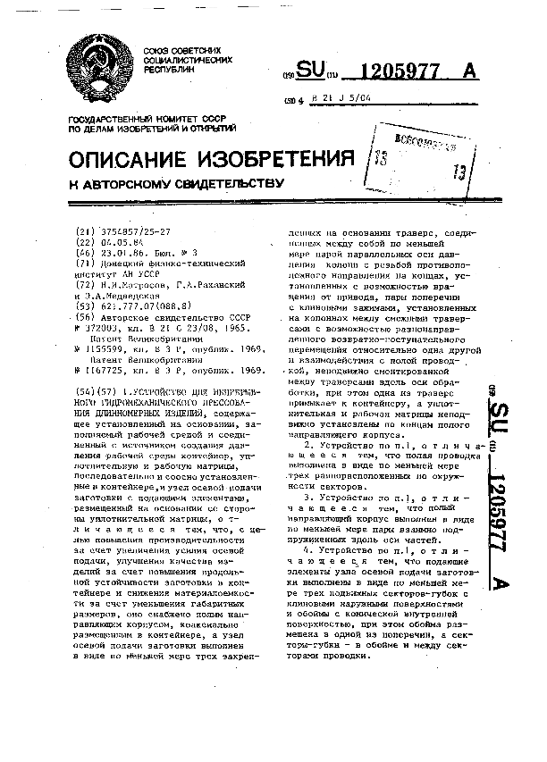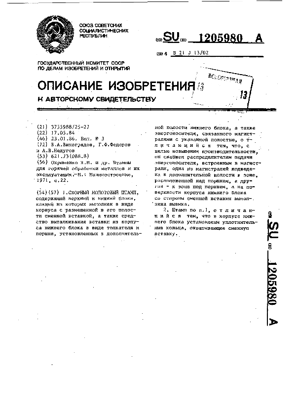 Сборный молотовый штамп / Виноградов В. А., Федоров Г. Ф., Недугов А. В. // Описания изобретений (ретрофонд) / Комитет по патентам и товарным знакам России. – М., 2003. – 1986, № 1. — (Патенты России). — Загл. с титул. экрана. — Поисковая система: ИПС MIMOSA GTI. — Систем. требования: Acrobat Reader. — Режим доступа: ftp://smolensklib.ru/bd/patent_ru/pt1205980.pdf. — <URL:ftp://smolensklib.ru/bd/patent_ru/pt1205980.pdf>.
