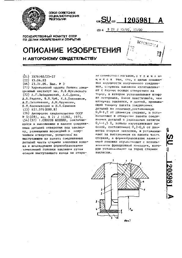Способ клепки / Лебединский А. Г., Данов А. С., Редько А. А. [и др.]; заявитель: Харьковский ордена Ленина авиационный институт им. Н. Е. Жуковского // Описания изобретений (ретрофонд) / Комитет по патентам и товарным знакам России. – М., 2003. – 1986, № 1. — (Патенты России). — Загл. с титул. экрана. — Поисковая система: ИПС MIMOSA GTI. — Систем. требования: Acrobat Reader. — Режим доступа: ftp://smolensklib.ru/bd/patent_ru/pt1205981.pdf. — <URL:ftp://smolensklib.ru/bd/patent_ru/pt1205981.pdf>.