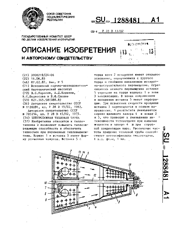 Центробежная тепловая труба / Карасев В. С., Корнеев А. Д., Подносова В. С., Слепов Б. Ф.; заявитель: Всесоюзный научно-исследовательский биотехнический институт // Описания изобретений (ретрофонд) / Комитет по патентам и товарным знакам России. – М., 2003. – 1987, № 1. — (Патенты России). — Загл. с титул. экрана. — Поисковая система: MIMOSA GTI. — Систем. требования: Acrobat Reader. — Режим доступа: ftp://smolensklib.ru/bd/patent_ru/pt1288481.pdf. — <URL:ftp://smolensklib.ru/bd/patent_ru/pt1288481.pdf>.