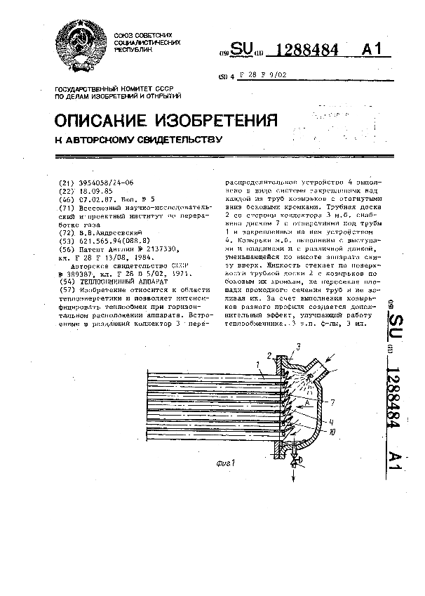 Теплообменный аппарат / Андреевский В. В.; заявитель: Всесоюзный научно-исследовательский и проектный институт по переработке газа // Описания изобретений (ретрофонд) / Комитет по патентам и товарным знакам России. – М., 2003. – 1987, № 1. — (Патенты России). — Загл. с титул. экрана. — Поисковая система: MIMOSA GTI. — Систем. требования: Acrobat Reader. — Режим доступа: ftp://smolensklib.ru/bd/patent_ru/pt1288484.pdf. — <URL:ftp://smolensklib.ru/bd/patent_ru/pt1288484.pdf>.