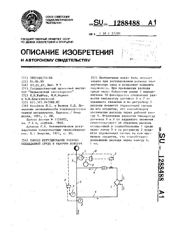 Способ регулирования расхода охлаждаемой среды в рабочем контуре / Райбер Я. М., Берман Л. М., Крастошевский З. М.; заявитель: Государственный проектный институт "Харьковский сантехпроект" // Описания изобретений (ретрофонд) / Комитет по патентам и товарным знакам России. – М., 2003. – 1987, № 1. — (Патенты России). — Загл. с титул. экрана. — Поисковая система: MIMOSA GTI. — Систем. требования: Acrobat Reader. — Режим доступа: ftp://smolensklib.ru/bd/patent_ru/pt1288488.pdf. — <URL:ftp://smolensklib.ru/bd/patent_ru/pt1288488.pdf>.