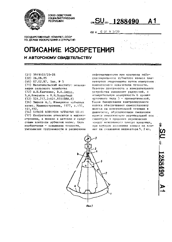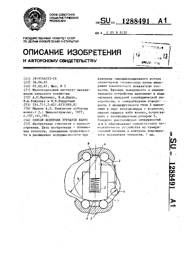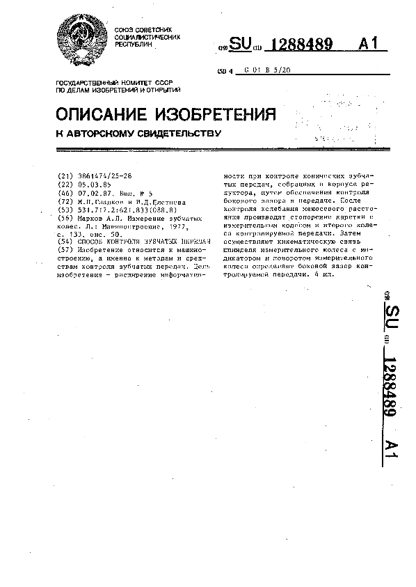 Способ контроля зубчатых колес / Панченко А. И., Дидур В. А., Кожухарь В. А., Поддубный В. Н.; заявитель: Мелитопольский институт механизации сельского хозяйства // Описания изобретений (ретрофонд) / Комитет по патентам и товарным знакам России. – М., 2003. – 1987, № 1. — (Патенты России). — Загл. с титул. экрана. — Поисковая система: MIMOSA GTI. — Систем. требования: Acrobat Reader. — Режим доступа: ftp://smolensklib.ru/bd/patent_ru/pt1288491.pdf. — <URL:ftp://smolensklib.ru/bd/patent_ru/pt1288491.pdf>.