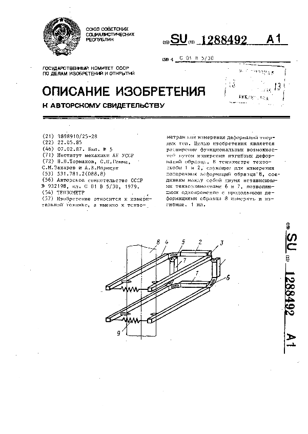 Тензометр / Тормахов Н. Н., Гемма С. П., Захаров С. М., Марищук А. В.; заявитель: Институт механики АН УССР // Описания изобретений (ретрофонд) / Комитет по патентам и товарным знакам России. – М., 2003. – 1987, № 1. — (Патенты России). — Загл. с титул. экрана. — Поисковая система: MIMOSA GTI. — Систем. требования: Acrobat Reader. — Режим доступа: ftp://smolensklib.ru/bd/patent_ru/pt1288492.pdf. — <URL:ftp://smolensklib.ru/bd/patent_ru/pt1288492.pdf>.