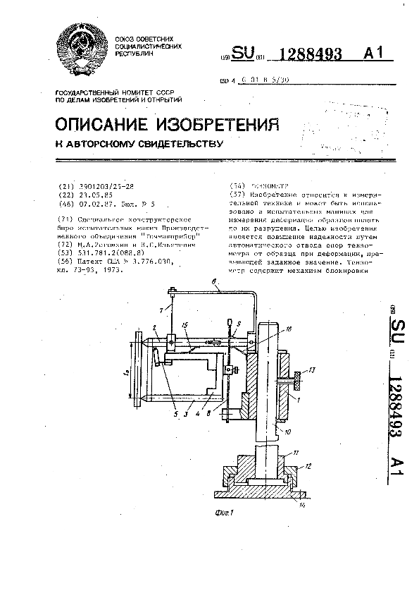 Тензометр / Рогожкин М. А., Ильяшевич В. С.; заявитель: Специальное конструкторское бюро испытательных машин Производственного объединения "Точмашприбор" // Описания изобретений (ретрофонд) / Комитет по патентам и товарным знакам России. – М., 2003. – 1987, № 1. — (Патенты России). — Загл. с титул. экрана. — Поисковая система: MIMOSA GTI. — Систем. требования: Acrobat Reader. — Режим доступа: ftp://smolensklib.ru/bd/patent_ru/pt1288493.pdf. — <URL:ftp://smolensklib.ru/bd/patent_ru/pt1288493.pdf>.