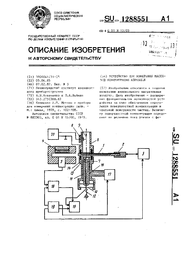 Устройство для измерения массовой концентрации аэрозоля / Козаченко В. И., Нейман Л. А.; заявитель: Ленинградский институт авиационного приборостроения // Описания изобретений (ретрофонд) / Комитет по патентам и товарным знакам России. – М., 2003. – 1987, № 1. — (Патенты России). — Загл. с титул. экрана. — Поисковая система: MIMOSA GTI. — Систем. требования: Acrobat Reader. — Режим доступа: ftp://smolensklib.ru/bd/patent_ru/pt1288551.pdf. — <URL:ftp://smolensklib.ru/bd/patent_ru/pt1288551.pdf>.