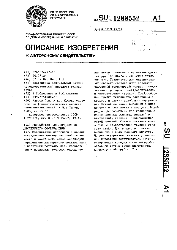 Устройство дня определения дисперсного состава пыли / Самсонов В. Т., Никитин В. С.; заявитель: Всесоюзный центральный научно-исследовательский институт охраны труда // Описания изобретений (ретрофонд) / Комитет по патентам и товарным знакам России. – М., 2003. – 1987, № 1. — (Патенты России). — Загл. с титул. экрана. — Поисковая система: MIMOSA GTI. — Систем. требования: Acrobat Reader. — Режим доступа: ftp://smolensklib.ru/bd/patent_ru/pt1288552.pdf. — <URL:ftp://smolensklib.ru/bd/patent_ru/pt1288552.pdf>.
