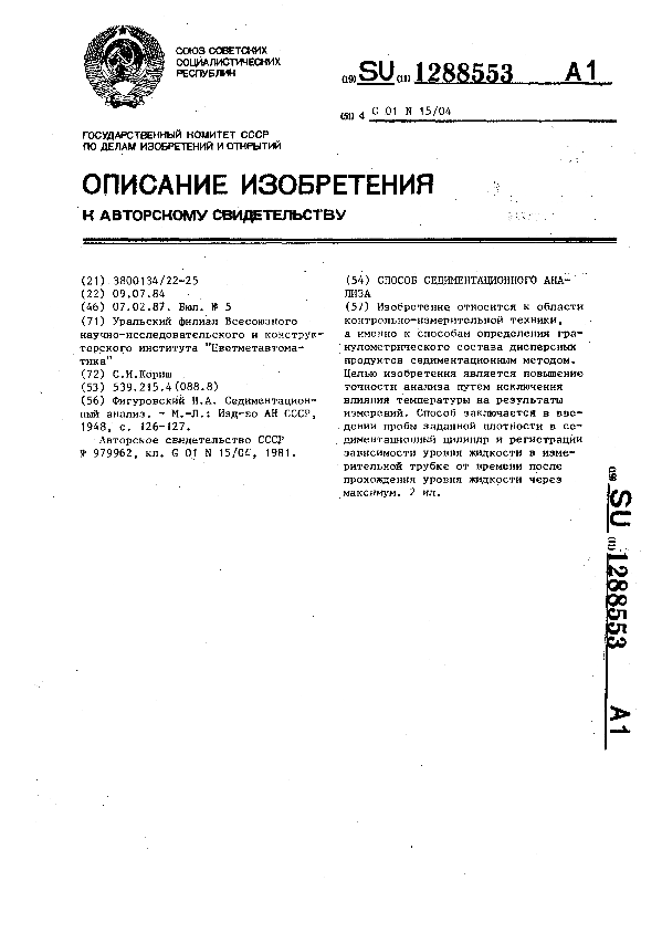Способ седиментационного анализа / Кориш С. И.; заявитель: Уральский филиал Всесоюзного научно-исследовательского и конструкторского института "Цветметавтоматика" // Описания изобретений (ретрофонд) / Комитет по патентам и товарным знакам России. – М., 2003. – 1987, № 1. — (Патенты России). — Загл. с титул. экрана. — Поисковая система: MIMOSA GTI. — Систем. требования: Acrobat Reader. — Режим доступа: ftp://smolensklib.ru/bd/patent_ru/pt1288553.pdf. — <URL:ftp://smolensklib.ru/bd/patent_ru/pt1288553.pdf>.