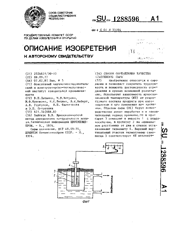 Способ определения качества плавленого сыра / Латышев В. П., Ветрова И. В., Кулешова М. Ф. [и др.]; заявитель: Всесоюзный научно-исследовательский и конструкторско-технологический институт холодильной промышленности // Описания изобретений (ретрофонд) / Комитет по патентам и товарным знакам России. – М., 2003. – 1987, № 1. — (Патенты России). — Загл. с титул. экрана. — Поисковая система: MIMOSA GTI. — Систем. требования: Acrobat Reader. — Режим доступа: ftp://smolensklib.ru/bd/patent_ru/pt1288596.pdf. — <URL:ftp://smolensklib.ru/bd/patent_ru/pt1288596.pdf>.