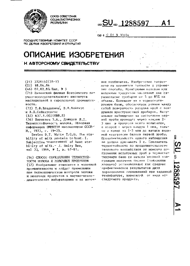 Способ определения термостойкости молока и молочных продуктов / Владыкина Т. Ф., Вайткус В. В., Сайкаускене В. Б.; заявитель: Литовский филиал Всесоюзного научно-исследовательского института маслодельной и сыродельной промышленности // Описания изобретений (ретрофонд) / Комитет по патентам и товарным знакам России. – М., 2003. – 1987, № 1. — (Патенты России). — Загл. с титул. экрана. — Поисковая система: MIMOSA GTI. — Систем. требования: Acrobat Reader. — Режим доступа: ftp://smolensklib.ru/bd/patent_ru/pt1288597.pdf. — <URL:ftp://smolensklib.ru/bd/patent_ru/pt1288597.pdf>.