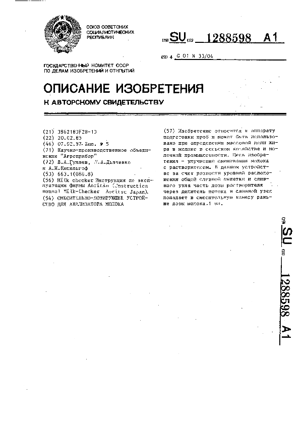 Смесительно-дозирующее устройство для анализатора молока / Гуляев В. А., Дьяченко Л. А., Кисильгоф А. И.; заявитель: Научно-производственное объединение "Агроприбор" // Описания изобретений (ретрофонд) / Комитет по патентам и товарным знакам России. – М., 2003. – 1987, № 1. — (Патенты России). — Загл. с титул. экрана. — Поисковая система: MIMOSA GTI. — Систем. требования: Acrobat Reader. — Режим доступа: ftp://smolensklib.ru/bd/patent_ru/pt1288598.pdf. — <URL:ftp://smolensklib.ru/bd/patent_ru/pt1288598.pdf>.