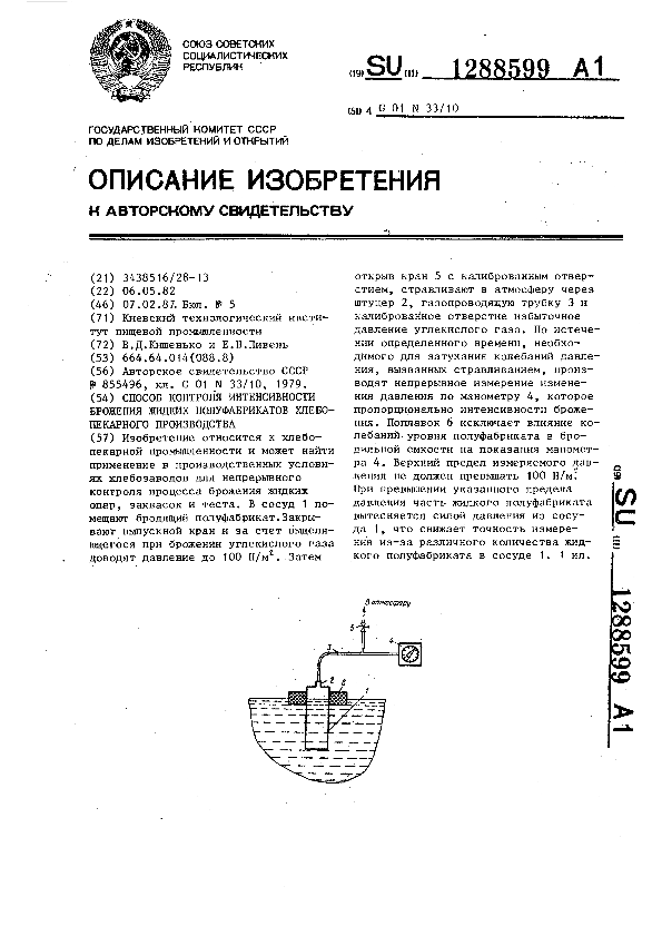 Способ контроля интенсивности брожения жидких полуфабрикатов хлебопекарного производства / Кишенько В. Д., Пивень Е. Н.; заявитель: Киевский технологический институт пищевой промышленности // Описания изобретений (ретрофонд) / Комитет по патентам и товарным знакам России. – М., 2003. – 1987, № 1. — (Патенты России). — Загл. с титул. экрана. — Поисковая система: MIMOSA GTI. — Систем. требования: Acrobat Reader. — Режим доступа: ftp://smolensklib.ru/bd/patent_ru/pt1288599.pdf. — <URL:ftp://smolensklib.ru/bd/patent_ru/pt1288599.pdf>.
