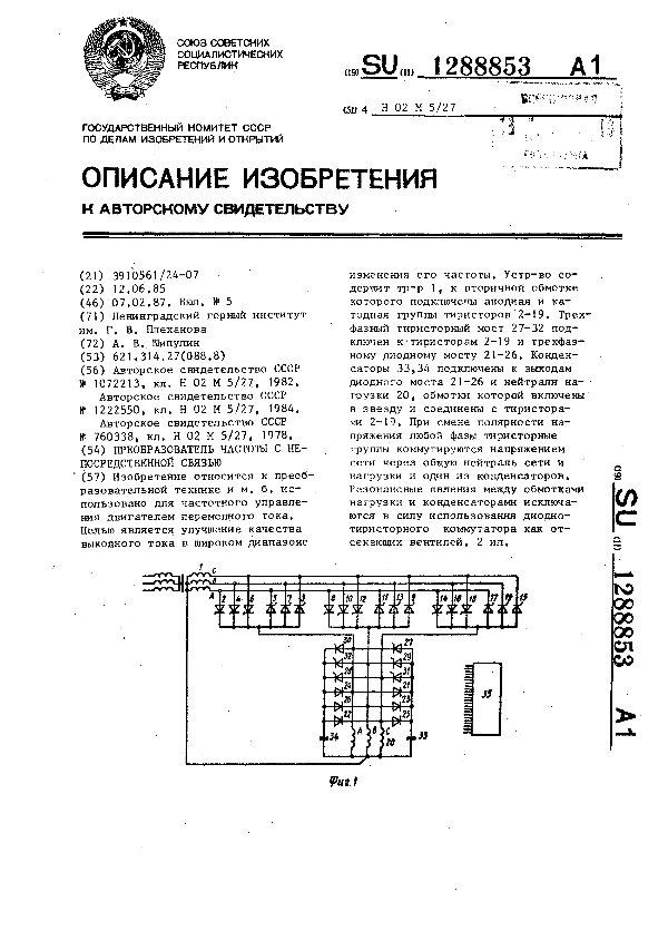 Преобразователь частоты с непосредственной связью / Шипулин А. В.; заявитель: Ленинградский горный институт им. Г. В. Плеханова // Описания изобретений (ретрофонд) / Комитет по патентам и товарным знакам России. – М., 2003. – 1987, № 1. — (Патенты России). — Загл. с титул. экрана. — Систем. требования: Acrobat Reader. — Режим доступа: ftp://smolensklib.ru/bd/patent_ru/pt1288853.pdf. — <URL:ftp://smolensklib.ru/bd/patent_ru/pt1288853.pdf>.