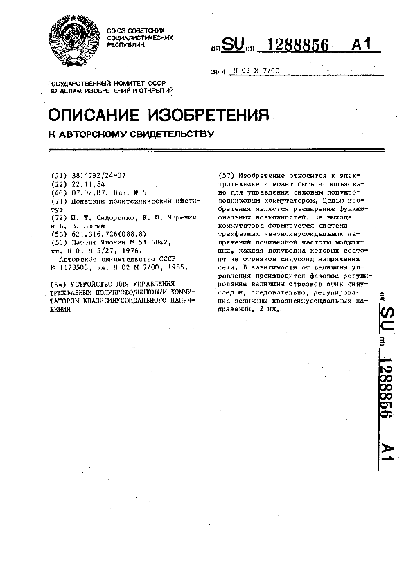 Устройство для управления трехфазным полупроводниковым коммутатором квазисинусоидального напряжения / Сидоренко И. Т., Маренич К. Н., Люсый В. В.; заявитель: Донецкий политехнический институт // Описания изобретений (ретрофонд) / Комитет по патентам и товарным знакам России. – М., 2003. – 1987, № 1. — (Патенты России). — Загл. с титул. экрана. — Систем. требования: Acrobat Reader. — Режим доступа: ftp://smolensklib.ru/bd/patent_ru/pt1288856.pdf. — <URL:ftp://smolensklib.ru/bd/patent_ru/pt1288856.pdf>.
